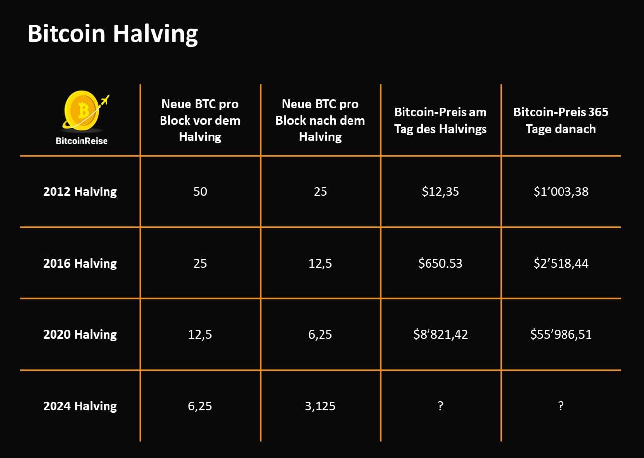 Im April 2024 steht die nächste Halbierung an. Dann werden nur noch 3,125 Bitcoin ca. alle 10 Minuten hinzukommen. Dieser Vorgang wiederholt sich insgesamt 32 Mal, bis letztendlich im Jahr 2140 alle 21 Millionen Bitcoin im Umlauf sind.