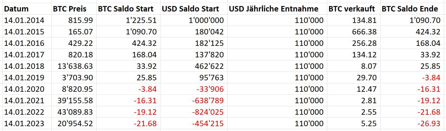 Angenommen du startest am 21. September 2015 mit einem Vermögen von 1'000'000 USD bzw. 4'412 BTC. Du entnimmst 4%, sprich 40'000 USD. Danach hast du noch 4'236 BTC. Im nächsten Jahr verkaufst du wieder Bitcoin für 40'000 USD. Da der Kurs gestiegen ist, musst du jedoch viel weniger Coins hergeben als im Vorjahr. So geht es immer weiter. Nach 10 Jahren ist dein Saldo noch immer positiv. Du bist nicht pleitegegangen. Im Gegenteil. Dein Vermögen in Dollar ist so hoch wie noch nie.