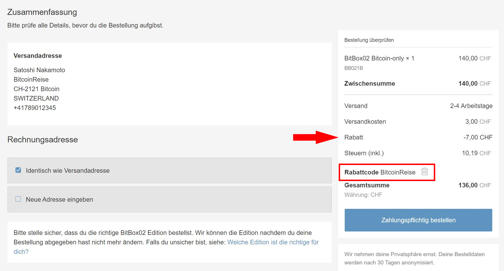 - Gib den BitBox Rabattcode BITCOINREISE ein.
