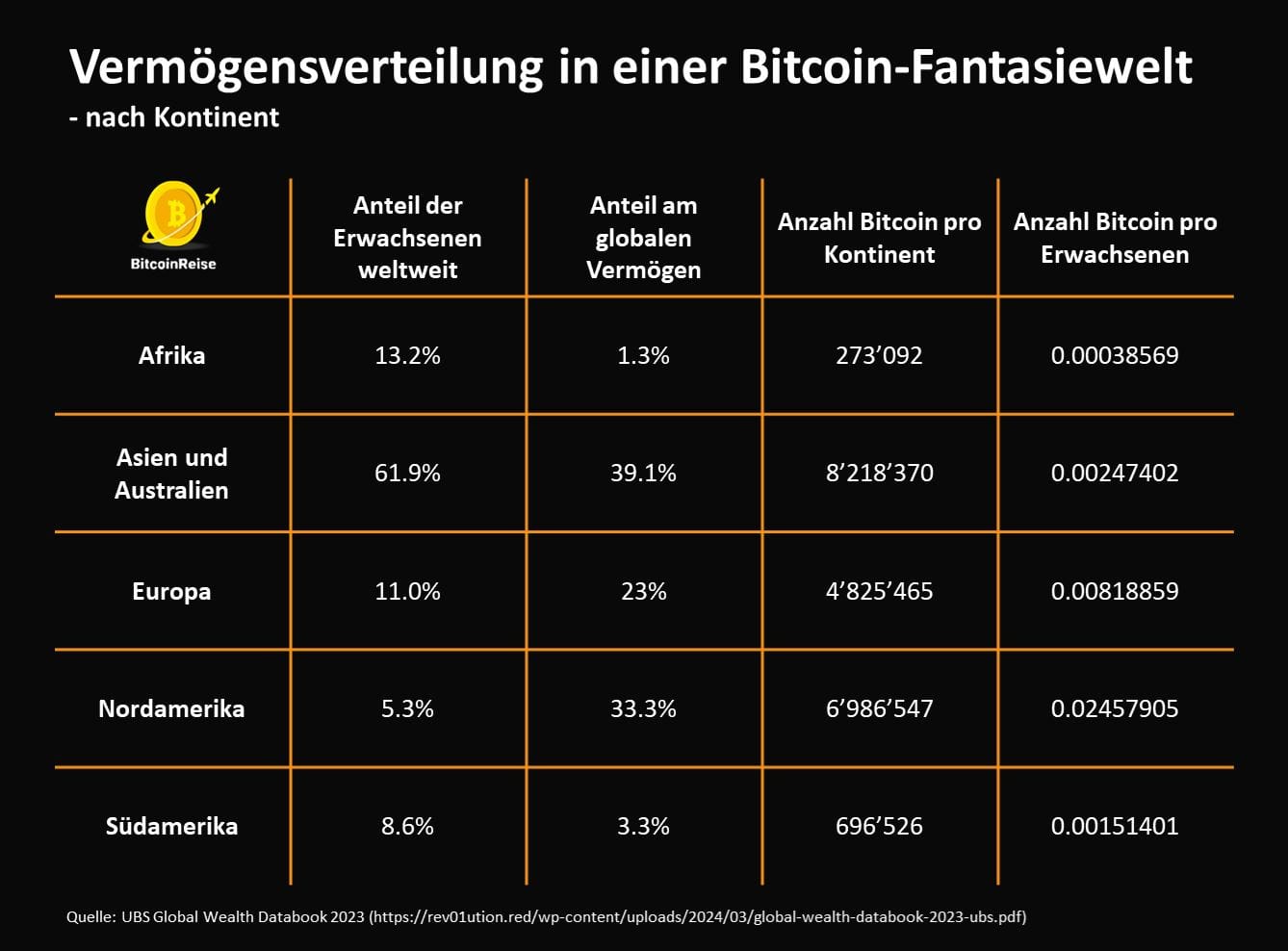 Bitte beachte, dass ich die Kontinente Asien und Australien zusammengefasst habe. Ausserdem habe ich die Antarktis nicht berücksichtigt. Dort leben ohnehin kaum Menschen und ich glaube nicht, dass die Millionen Pinguine jemals mit Bitcoin-Geld handeln werden.