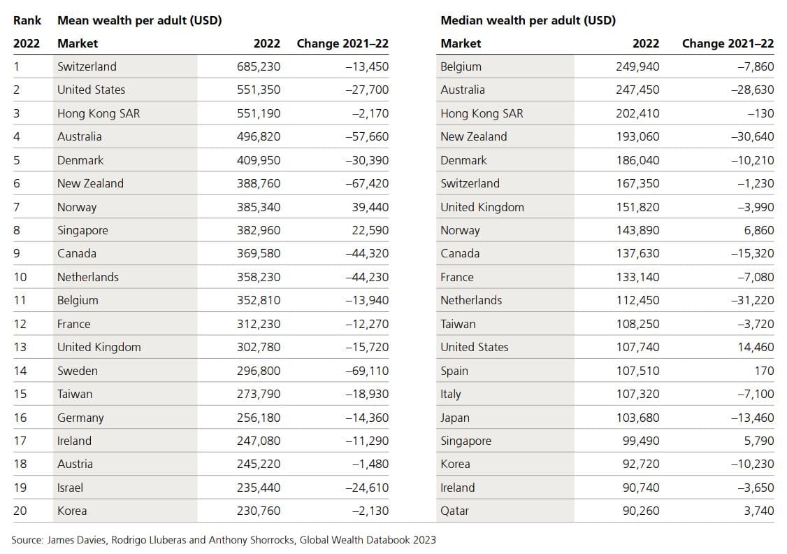 Übrigens: Die Schweiz liegt mit ihrem Durchschnittsvermögen pro Kopf auf Platz 1 und damit vor den USA. Deutschland liegt auf Platz 16 und Österreich auf Platz 18. Im Median hingegen belegt Belgien mit Besitztümern von knapp 250'000 USD pro Erwachsenen den 1. Platz. Die Schweiz liegt auf Platz 6, und sowohl Deutschland als auch Österreich fallen nicht unter die Top 20.