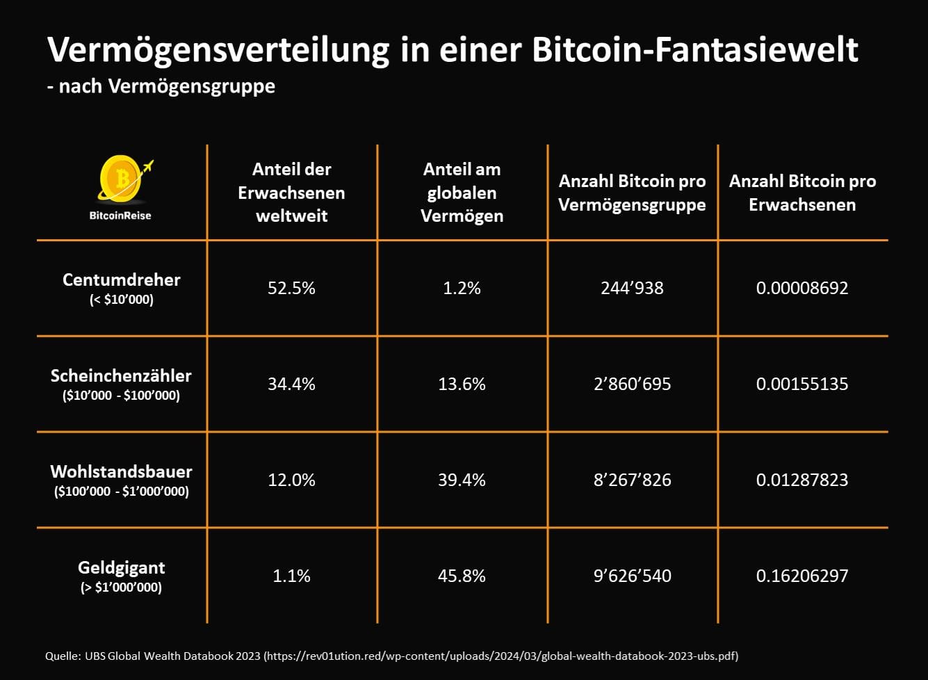 Über die Hälfte der Bevölkerung gehört zur Gruppe Centumdreher. Sie besitzen ein Vermögen von unter 10'000 USD. Bei einem Bitcoin-Standard mit derselben Vermögensverteilung wie in der jetzigen Welt hätten sie lediglich 0,00008692 Bitcoin, bzw. 8'692 Satoshis.