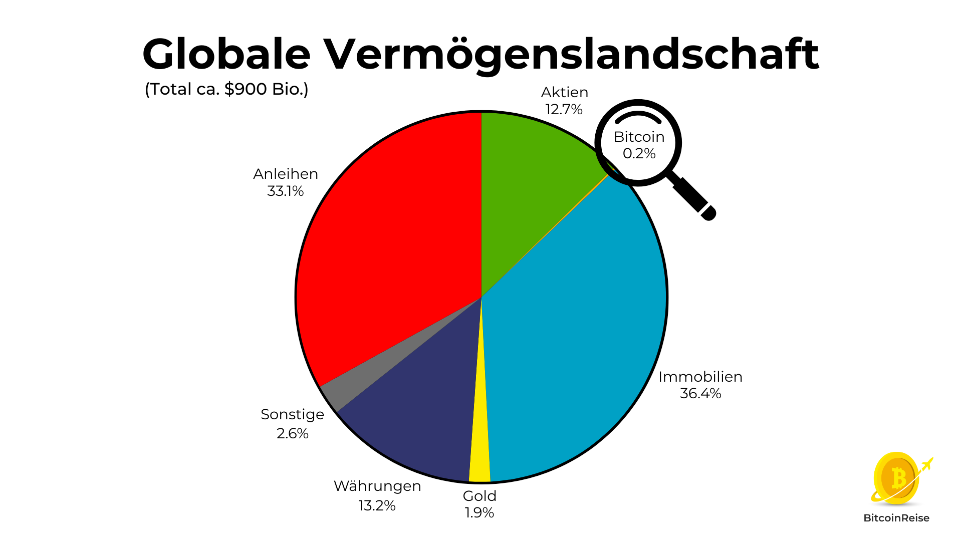 Das gesamte globale Vermögen wird auf etwa $900 Billionen geschätzt. Aktuell ist Bitcoins Anteil davon gerade mal 0.2%.