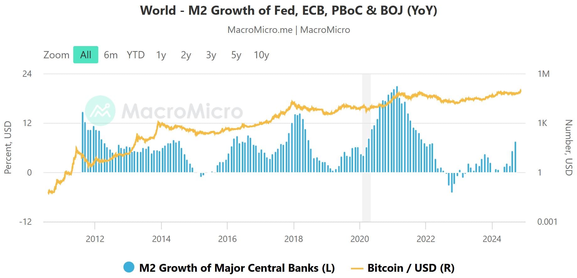 Zudem gab es in der Vergangenheit eine deutliche Korrelation zwischen der globalen Geldmenge und dem Bitcoin-Kurs. Immer dann, wenn mehr Geld in den Umlauf kam, stieg der Preis von Bitcoin.