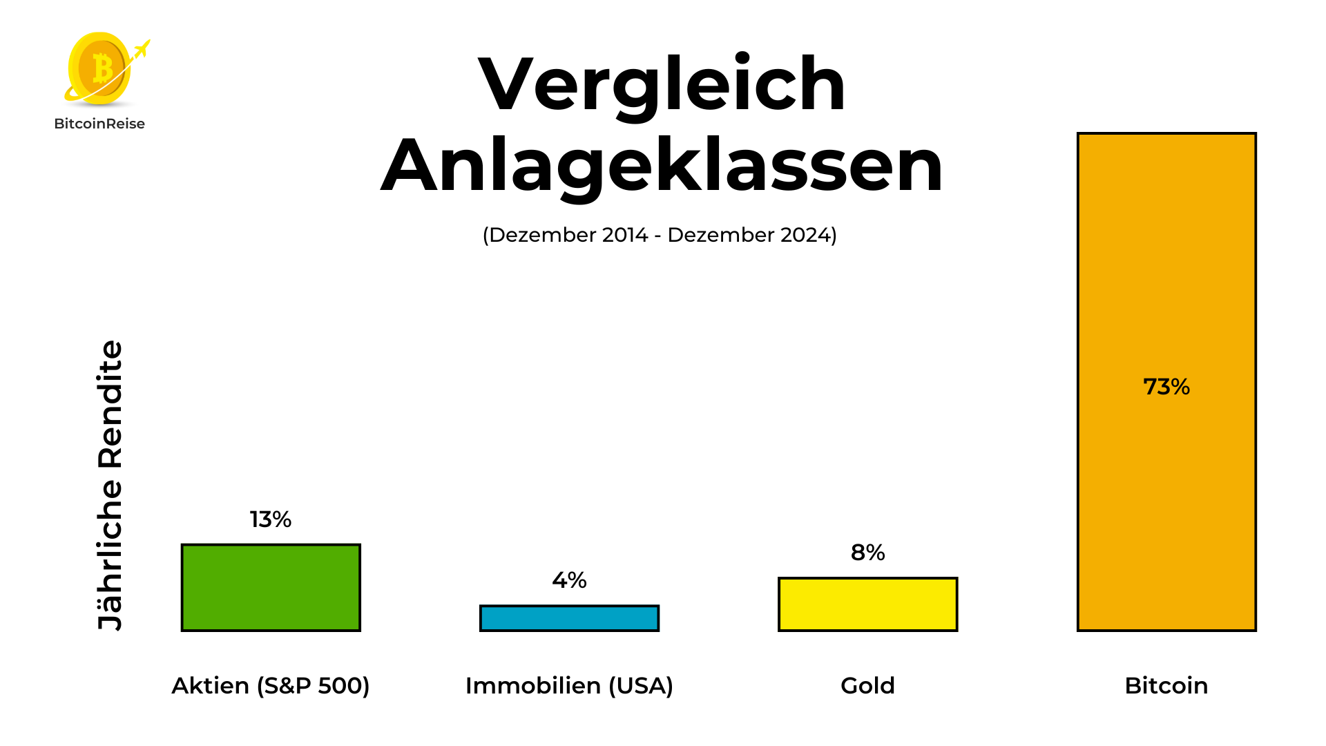 In den letzten 10 Jahren lag Bitcoins jährliche Rendite bei 73%. Und in den letzten 5 Jahren bei 65%.