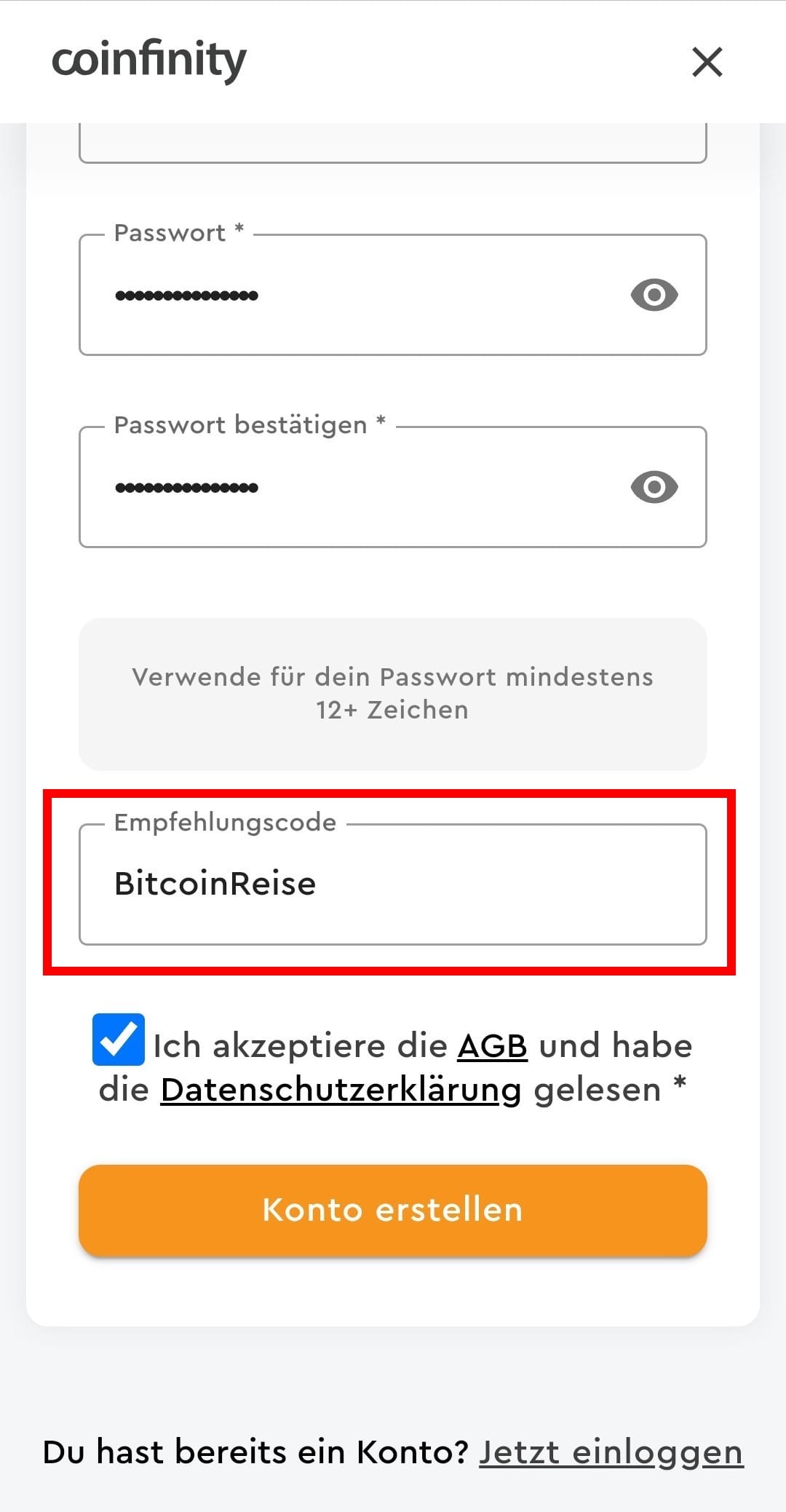 - Gib den Coinfinity Empfehlungscode BITCOINREISE ein.