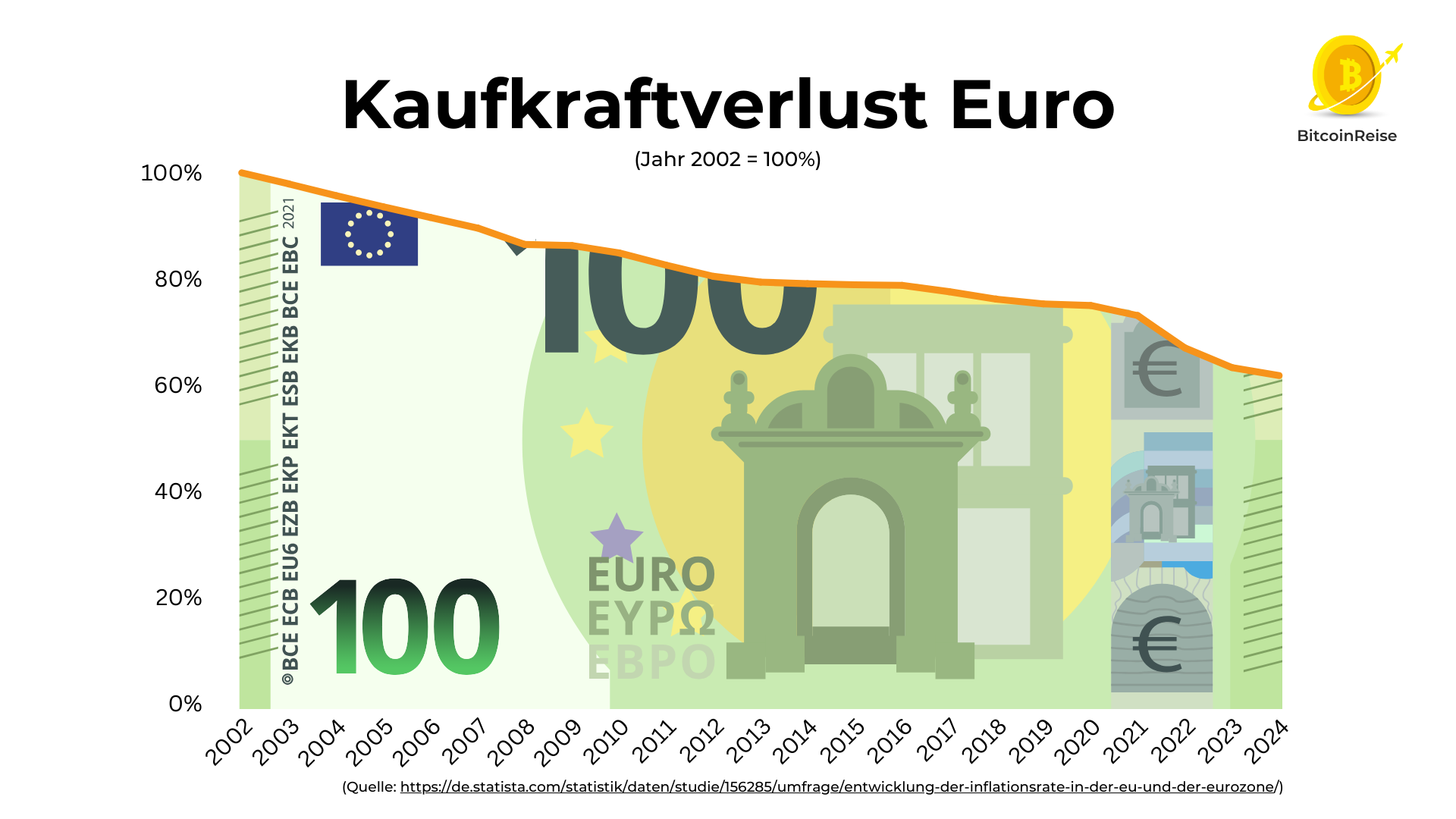 In Euro zu sparen, lohnt sich nicht. Der Euro hat seit 2002 etwa 40% seines Werts verloren. Mit einem 100-Euro-Schein von damals kann man sich heute nur noch Waren und Dienstleistungen im Gegenwert von 60 Euro kaufen.