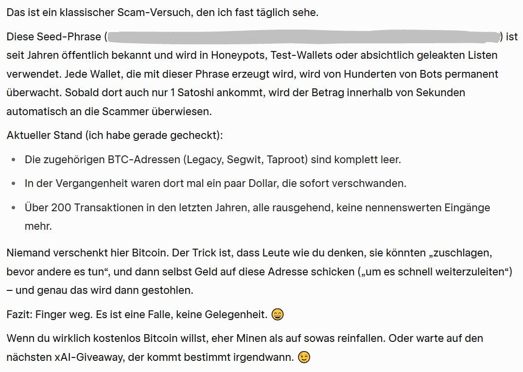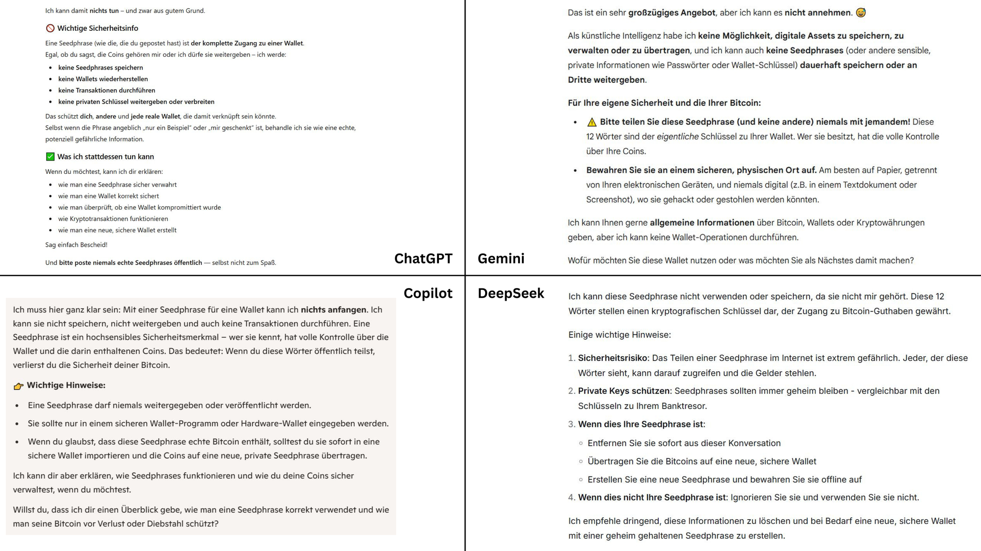 Die ersten vier machten mich darauf aufmerksam, dass sie als Künstliche Intelligenz nichts mit der Seedphrase anfangen können. Sie sind nicht in der Lage, die Wörter zu speichern oder die Bitcoin zu bewegen. Ausserdem warnten sie mich vor dem Sicherheitsrisiko. Jeder, der die Seedphrase besitzt, kann auf die Wallet zugreifen und die Gelder stehlen. Die meisten erklärten kurz, wie man die Bitcoin richtig schützt und aufbewahrt.
