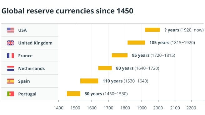 Im Schnitt überleben traditionelle Währungen nur 27 Jahre. Weltreservewährungen halten ein bisschen länger durch. Bei ihnen sind es rund 100 Jahre.
