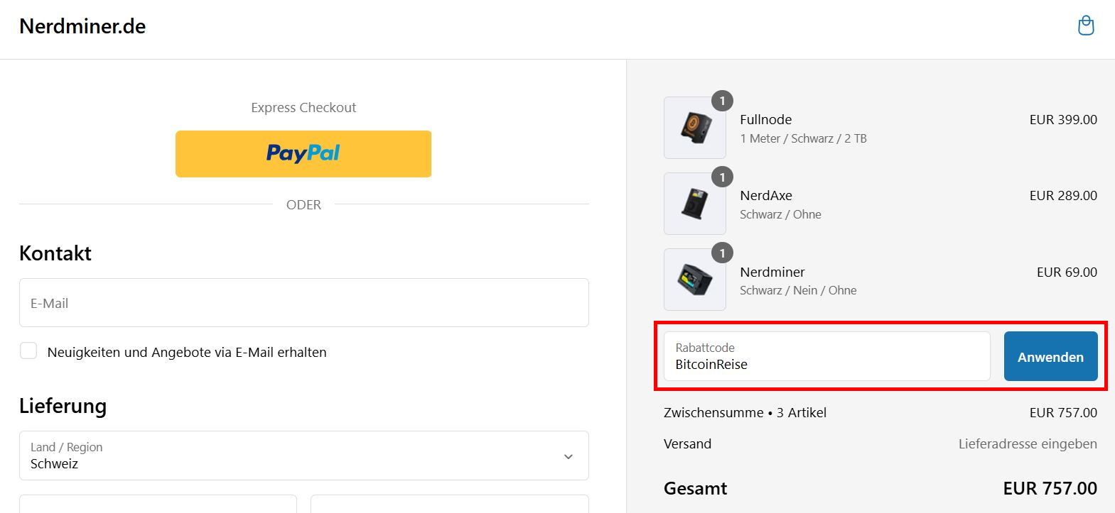 - Gib den Nerdminer Rabattcode BITCOINREISE ein.