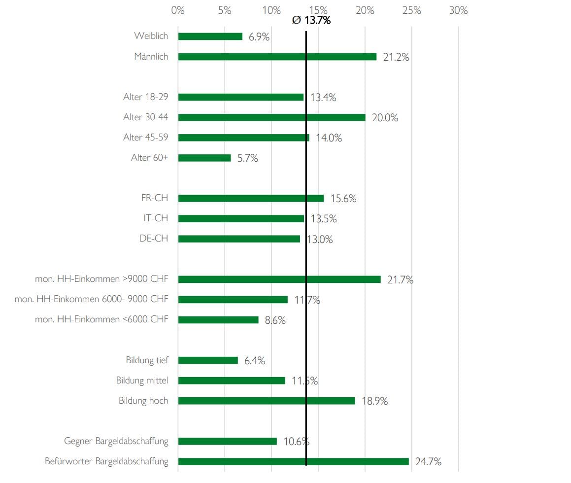 Wenn man sie auf die gesamte erwachsene Bevölkerung in der Schweiz hochrechnet, erhält man einen investierten Gesamtbetrag von etwa CHF 19,8 Milliarden. Da im Mai dieses Jahres, als die Befragung durchgeführt wurde, der Bitcoin-Preis bei CHF 60'000 stand, kann man annehmen, dass sich etwa 330'000 Bitcoin in der gesamten Schweizer Bevölkerung befinden.