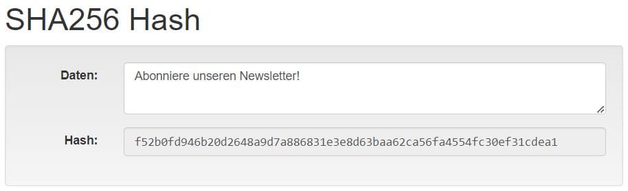 Wenn du aber einem SHA256-Rechner den Input Abonniere unseren Newsletter gibst, erhältst du genau den gesuchten Hash.