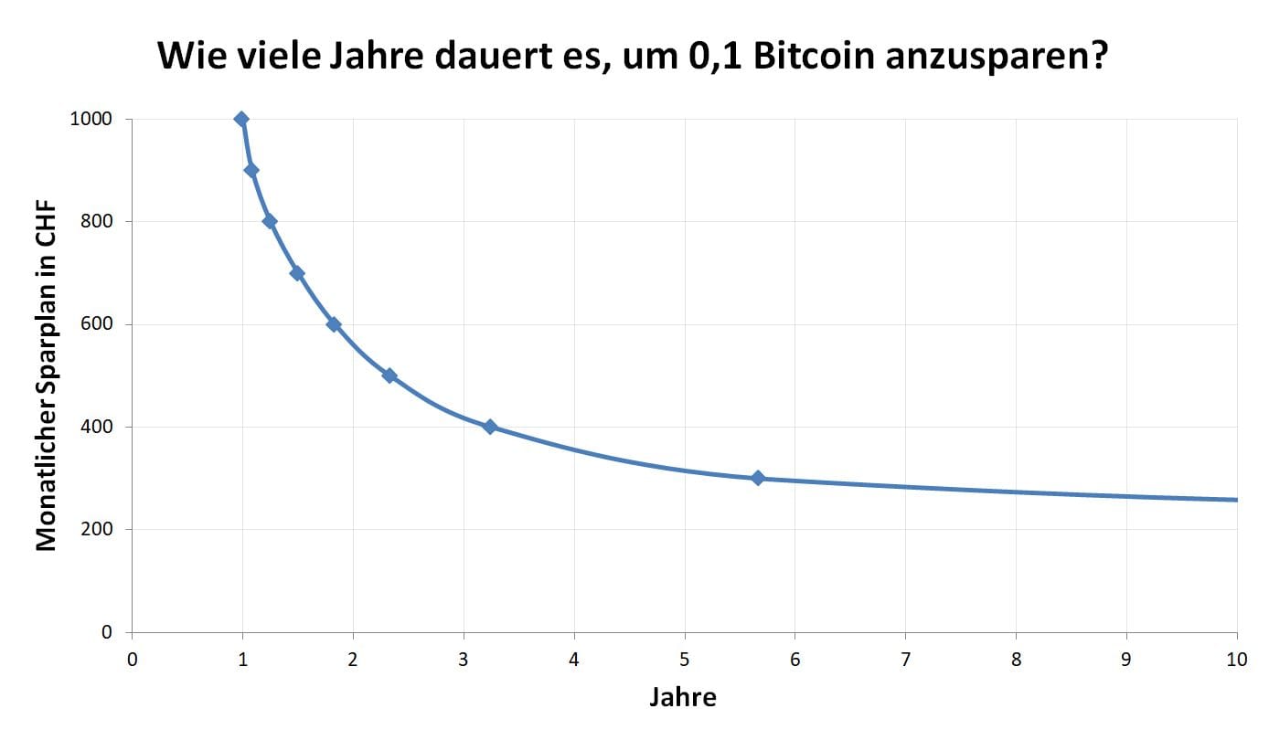Untenstehend siehst du eine Übersicht, wie lange es je nach Sparrate dauert, um 0,1 Bitcoin zu erreichen.